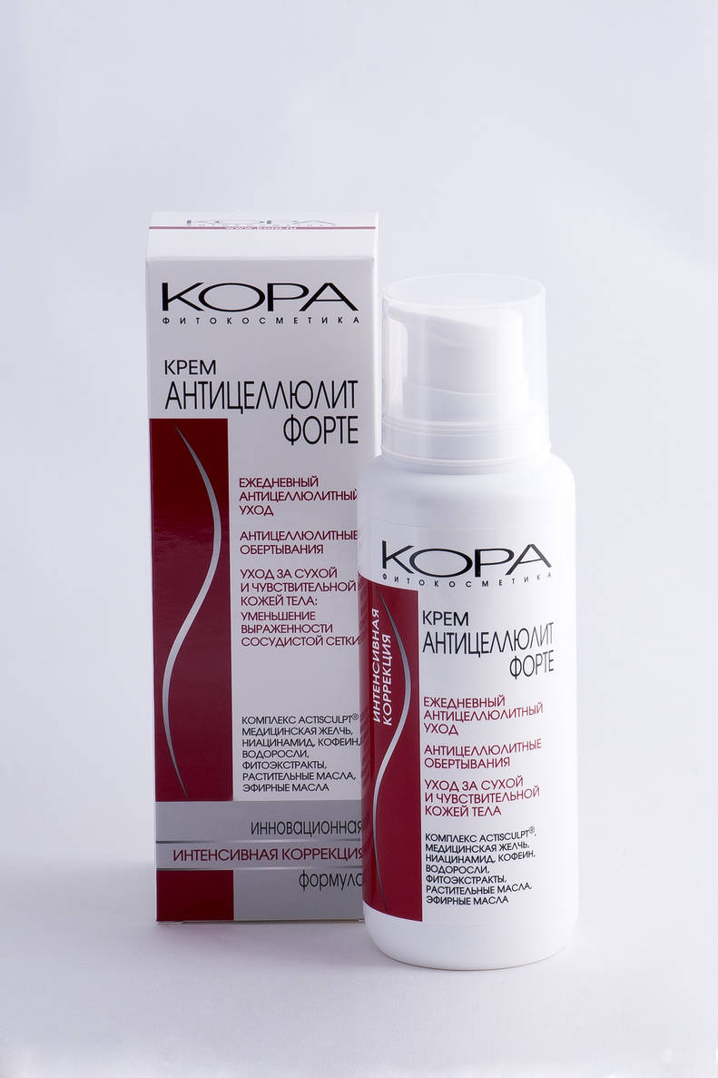 Для профилактики и устранения целлюлита, а также для закрепления результатов профессиональных антицеллюлитных процедур «КОРА» предлагает Крем Антицеллюлит Форте на основе уникального комплекса натуральных компонентов. Насыщенная формула крема существенно выравнивает и подтягивает кожу, повышает ее упругость и эластичность, оказывает длительное липолитическое воздействие. За счет выведения из кожных тканей жира, токсинов и излишней жидкости крем помогает уменьшить объемы проблемных зон и корректирует силуэт. Кроме того, средство уменьшает выраженность сосудистой сетки на коже бедер и голеней.
