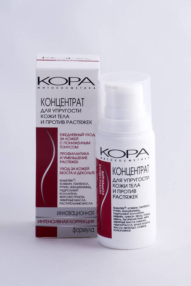 Интересно отметить, что косметику марки «КОРА» можно использовать как самостоятельные средства, так и в комплексе с другими антицеллюлитными продуктами для повышения их эффективности. Таким средством является Концентрат для упругости кожи тела и против растяжек, представляющий собой революционную систему самовосстановления структуры и упругости кожи. Концентрат рекомендуется для ежедневного ухода за утратившей тонус кожей тела и особенно для восстановления упругости кожи бюста и декольте, внутренней зоны предплечья и бедер. Усиливая синтез коллагена и активизируя регенерацию клеток, средство повышает эластичность кожи, позволяет избежать ее обвисания в связи с возрастными изменениями или при резком снижении веса, способствует уменьшению видимых признаков увядания кожи, помогает предотвратить появление растяжек, а уже существующие делает менее заметными.