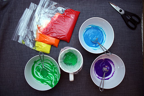 Важно! Чтобы получилась настоящая радуга, а не просто разноцветная смесь, нужно разделить тесто на 7 неравных порций. Каждую часть окрашиваем своим цветом. У нас от большего количества теста к меньшему: белое (то есть тесто без красителей), красное, оранжевое, желтое, зеленое, синее, фиолетовое.