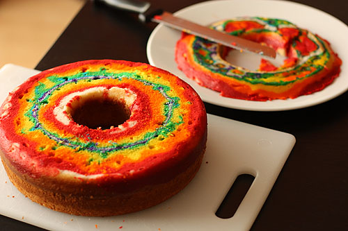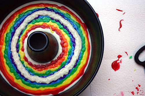 После того, как кекс остынет, срежьте с него тонкий слой верха, где краски некрасиво перемешались. Затем переверните его срезанной стороной на блюдо.