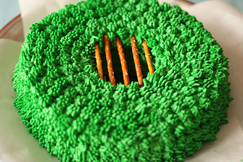 Оставшийся крем выкладываем в кондитерский шприц с резной насадкой и выдавливаем небольшими порциями на кекс, имитируя траву.