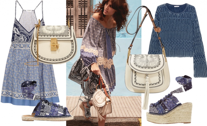 Основным мотивом отпускной коллекции Chloé для Net-a-Porter стали хрестоматийные морские цвета – синий, белый и голубой, а также сочетание узоров пейсли и ситчик. В линию вошли легкие платья и туники, свободные брюки, босоножки на плетеной подошве и канонические сумки Chloé Drew и Hudson в белом цвете с орнаментом.
