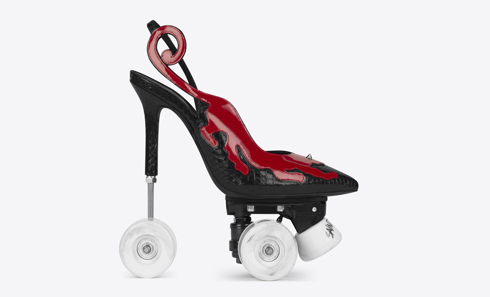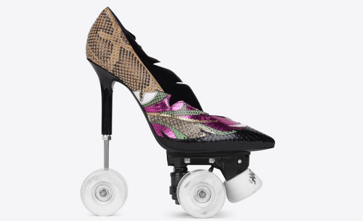 В осенней коллекции креативный директор Saint Laurent Энтони Ваккарело предложил обувь на шпильках в форме культового лого YSL, а теперь вообще выпустил туфли на роликах. Экстремальная модель получила название Anya 100 Patch Pump Roller. Остроносые лодочки выполнены из разных видов кожи и декорированы клепками, кристаллами и яркими аппликациями. Но главное у них под каблуком - настоящие колеса, как у роликовых коньков из 80-х. Одно расположено под шпилькой, другое - под носком. Инструкции, как в них передвигаться, не прилагается. Стоимость пары составит 2600 долларов.