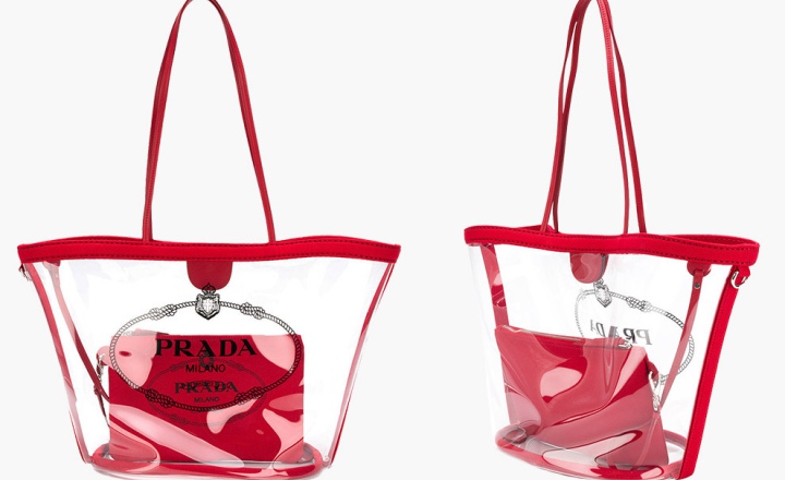 Вслед за коллекциями Jil Sander и Chanel сумки из бесцветной, прозрачной пластмассы появились и в ассортименте Prada. Это вместительные модели с большим логотипом и двумя вариантами цвета канта – красным и черным. Сумки уже в продаже по цене 59 000 рублей.