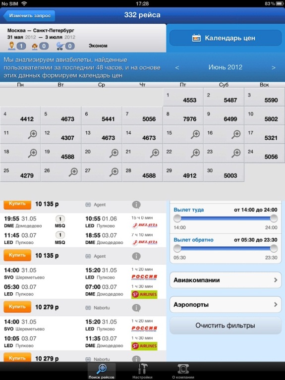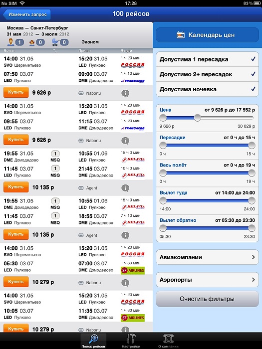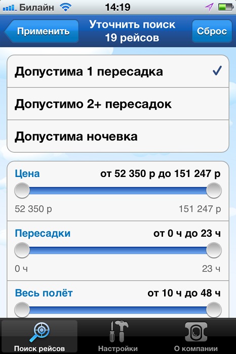 В приложении можно настроить фильтры: допустимы ли пересадки, поставить ограничения по времени вылета и прилета, продолжительности полета и пересадок, выбрать авиакомпанию и аэропорт пересадки.