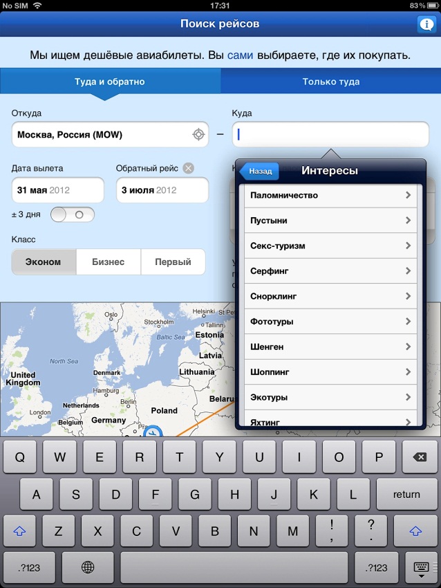 Иногда бывает и наоборот: есть накопленная на отпуск сумма, но непонятно, куда же все-таки хочется. Для неопределившихся в приложении есть маршруты по интересам с ценами - море и пляжи, безвизовые страны, горные лыжи, пустыни, гастрономические туры для любителей поесть и алкотуры для любителей понятно чего, и многое другое. Эта возможность есть только в приложении для iPad.