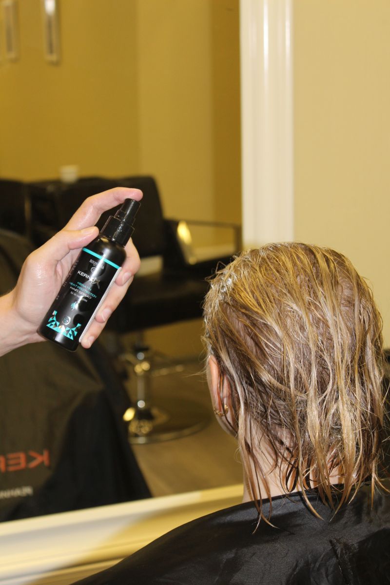 4. Завершение процедуры с термозащитным спреем Kernox Finish Treatment. Его задача - растворить активные компоненты, не вступившие в химическую реакцию, плотно закрыть кутикулярный слой и активировать термомасла.