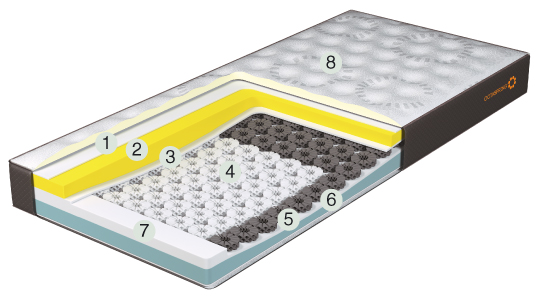 Новый матрас оказывает зональную поддержку каждому участку тела за счет плавного перехода от более жесткой поверхности для области поясницы к более мягкой – для области ног и головы. Средний слой матраса выполнен из пенных пружин Octaspring, изготовленных по бельгийской технологии. Благодаря своей структуре пружина адаптируется к каждому движению и оказывает индивидуальную 3D поддержку, а также обеспечивает воздухопроницаемость, что важно для терморегуляции тела. Слои из высокоэластичной пены оказывают надежную поддержку позвоночника в течение длительного срока эксплуатации. Более мягкий материал Memory Foam с угольной пропиткой запоминает изгибы тела, не оказывая давления на мышцы и суставы.
