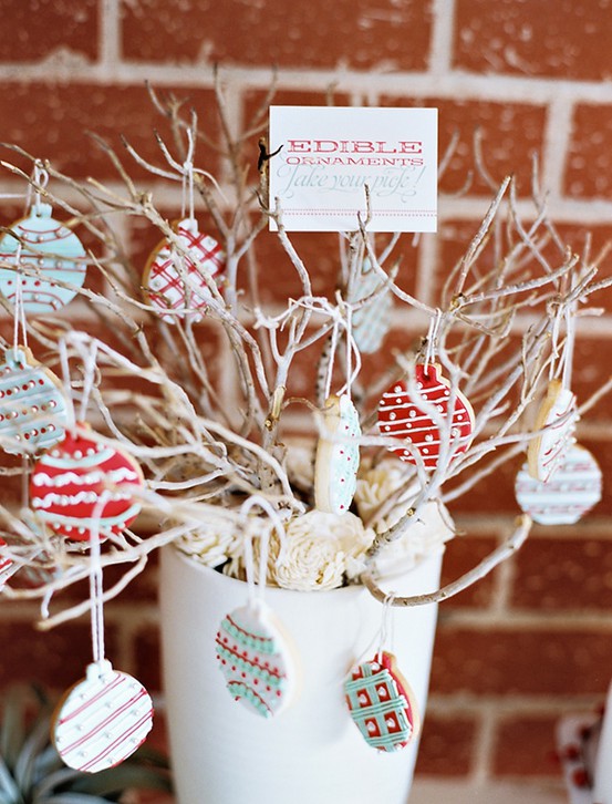Рождественское дерево из окрашенных в белый цвет ветвей и глазированного печенья в форме елочных шаров. Главное - выбрать устойчивую вазу, которая не перевернется в самый неподходящий момент.