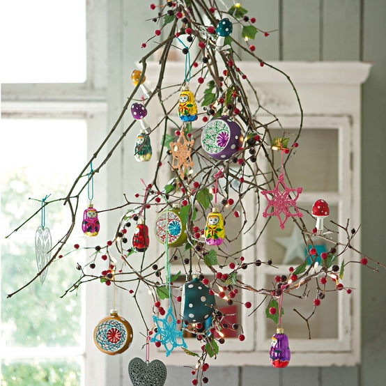 Прочные веточки, гирлянда из бусин, напоминающих ягоды, легкие елочные украшения - все собрано в единый "букет" и подвешено на манер потолочного светильника. Мне очень нравится эта идея, нужно только заранее продумать безопасное и надежное крепление всей декоративной конструкции.