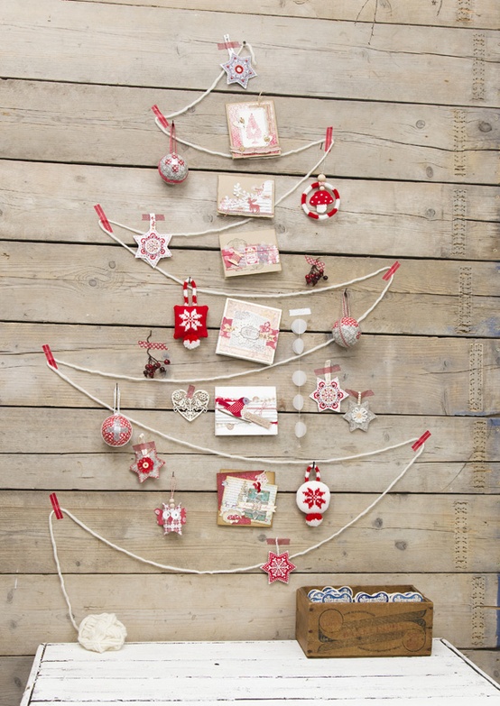 А эту "ель" сделать еще проще: крепкий шнур или толстую нить закрепляют с помощью небольшого гвоздика и крепкого скотча контрастного цвета, формируя на стене контур елки. Легкие елочные украшения (ими могут стать картинки, открытки, фото) держатся с помощью того же скотча, а игрушки потяжелее нужно закрепить надежнее, например, повесив из за декоративную ленту на вбитые гвозди.