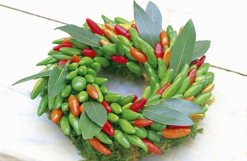 Этот забавный венок из перчиков чили, лавра и мха получился таким объемным благодаря специальной кольцевидной основе - флористической губке (ее называют "оазис"). Купить ее можно практически в каждом садовом центре или флористическом магазине.