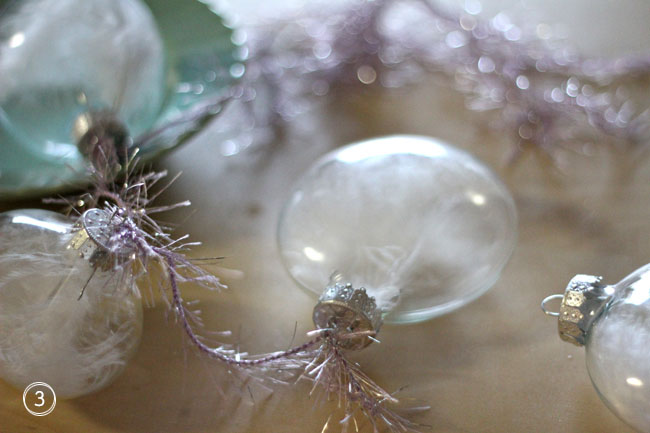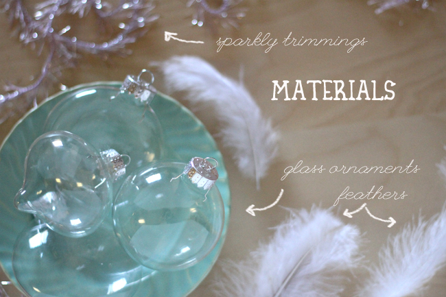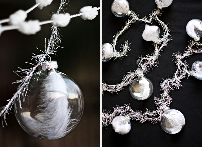 Для изготовления гирлянды нам понадобятся стеклянные елочные шары. Обязательный момент – они должны быть прозрачными. Также понадобятся красивые перья (их можно купить в магазине рукоделия или тканей), цвет которых зависит исключительно от ваших предпочтений. Перья светлых оттенков создадут эффект «легкости» в помещении, а более ярких – привлекут к гирлянде больше внимания.