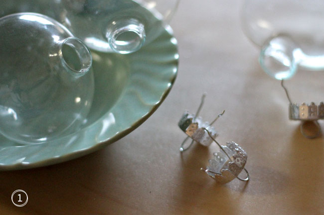 Аккуратно зажимая проволочное колечко-ушко большим и указательным пальцами, снимите металлический колпачок у каждого стеклянного шара. Не пораньтесь!