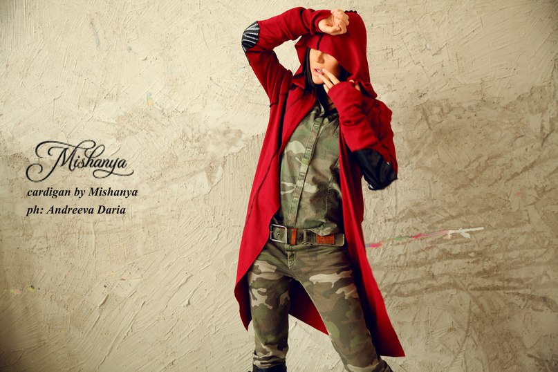 Затем я поняла, что давно хотела накидку с капюшоном, под каблук и джинсы - вещь для меня незаменимая! И я придумала очень простую, но в то же время стильную вещицу, с нарочито необработанными краями, швами наизнанку, большим капюшоном и спущенными рукавами. В таком кардигане я чувствую себя уютно, но при этом сексуально. Забрендила спину декорацией в виде буквы М. Сейчас кардиганы by Mishanya раскупаются как горячие пирожки через группу в контакте. У меня есть уже помощница, которая обрабатывает заказы.