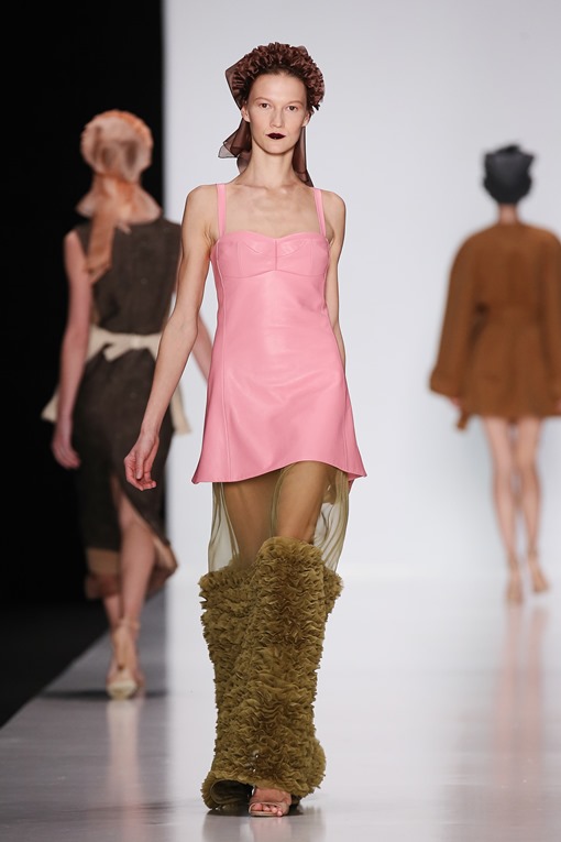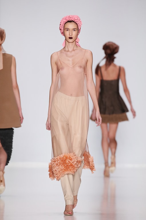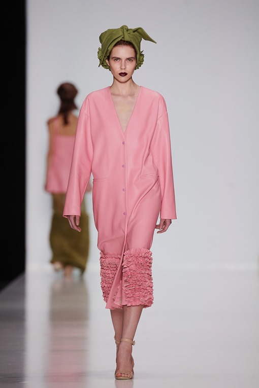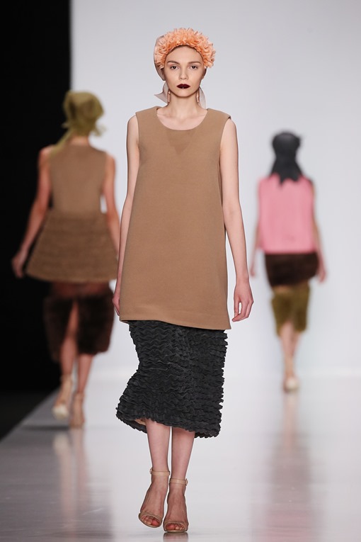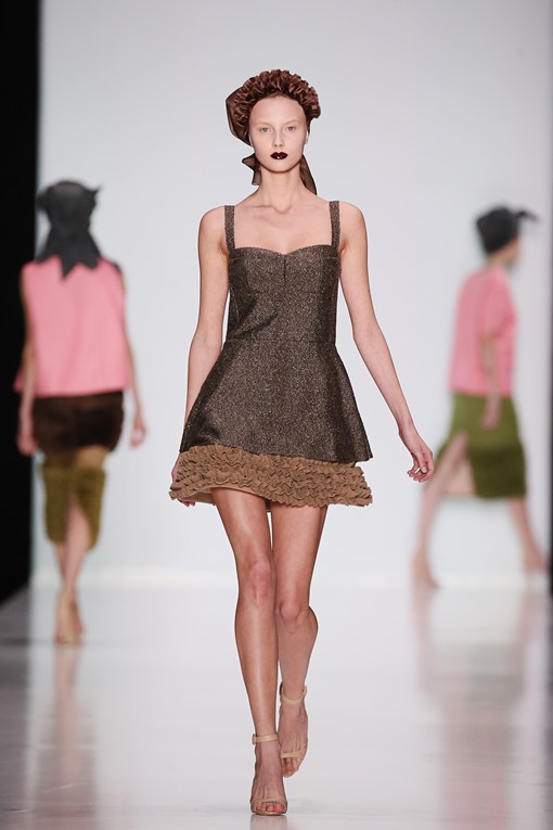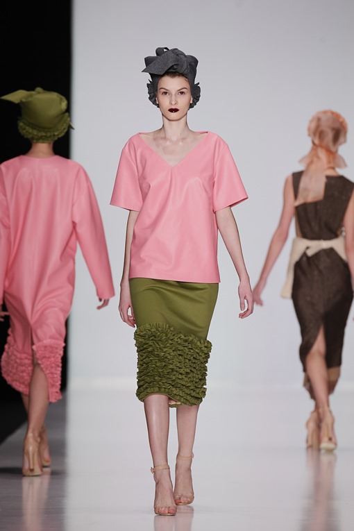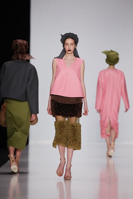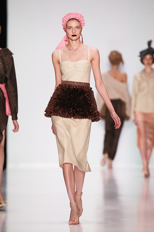 Для новой коллекции Ruban характерны нетривиальные контрасты - прозрачность и плотность, объем и приталенные формы, эксперименты с многослойностью, обыгрывание классических трапециевидных и А-образных силуэтов и конфетно-мороженная цветовая палитра: фисташковый, кремовый, лиловый, розовый. Головные уборы напоминают то ли чепчики, то ли венки, то ли повязанные на украинский манер платки. Они делают образы праздничными и немного сказочными, как и объемная отделка юбок из плотно сшитых воланами кусочков ткани.