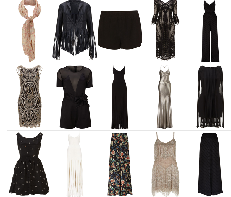В коллекции Кейт Мосс для Topshop особое место занимают платья и жакеты. Бахрому и кожу модель использовала для создания смелых, летящих силуэтов, для вечерних платьев предпочла облегающие формы, кружево и длину в пол.