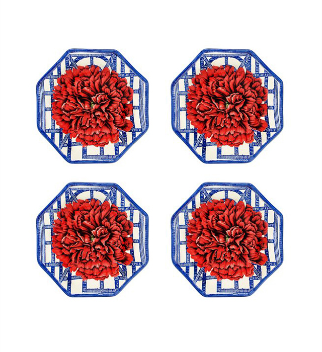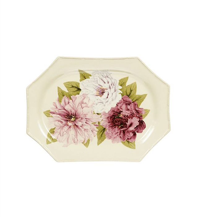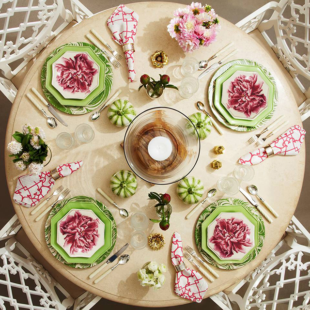 Креативный директор бренда Каролина Ирвинг для создания посуды и аксессуаров для дома Oscar de la Renta обратилась за вдохновением к Ботаническому саду Нью-Йорка. Текстуры, орнаменты и конкретные изображения были созданы по материалам самой природы. Керамические тарелки украшают пионы и листья - иллюстрации из ботанических книг XVIII-XIX веков из архива Ботанического сада.