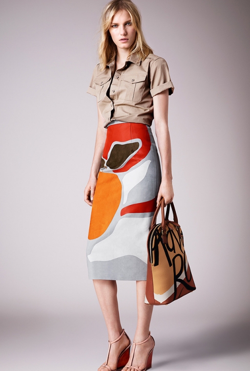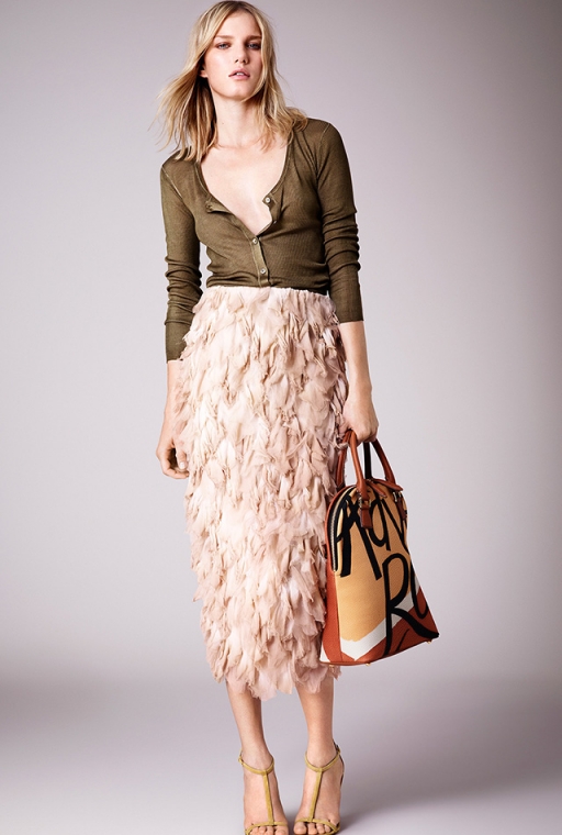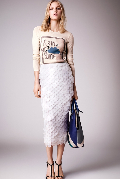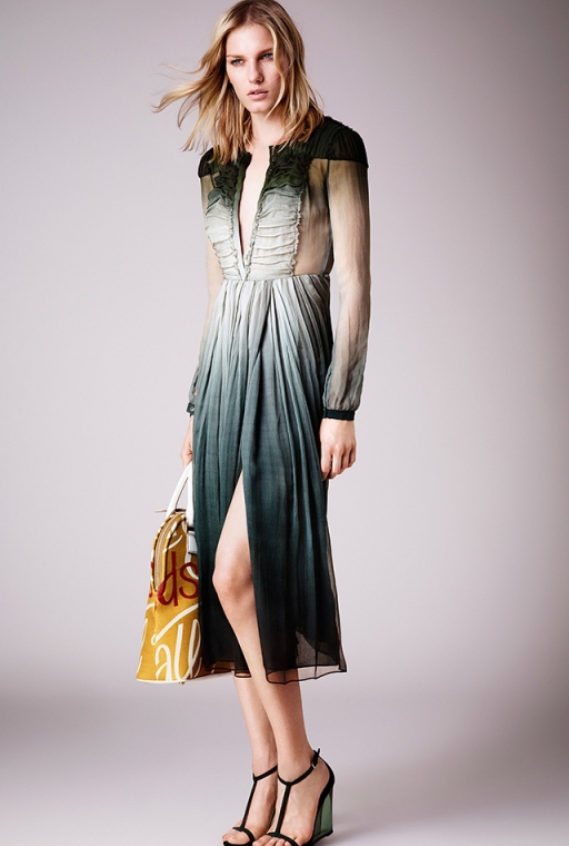 Кристофер Бейли соединил романтичные и откровенные шелковые платья с плотными хлопковыми тренчами – получилась своеобразная метафора. Текстовые цветные принты в сочетании с классическими жакетами и элегантными босоножками составили яркие оксюмороны. На этом художественные тропы не закончились: элементы стиля сафари, пальто и тренчи песочного оттенка с большими пуговицами и накладными карманами, интеллигентный градиент и юбки из крупных пайеток выступли в роли эпитетов – Кристоферу Бейли впору самому сочинять книги.