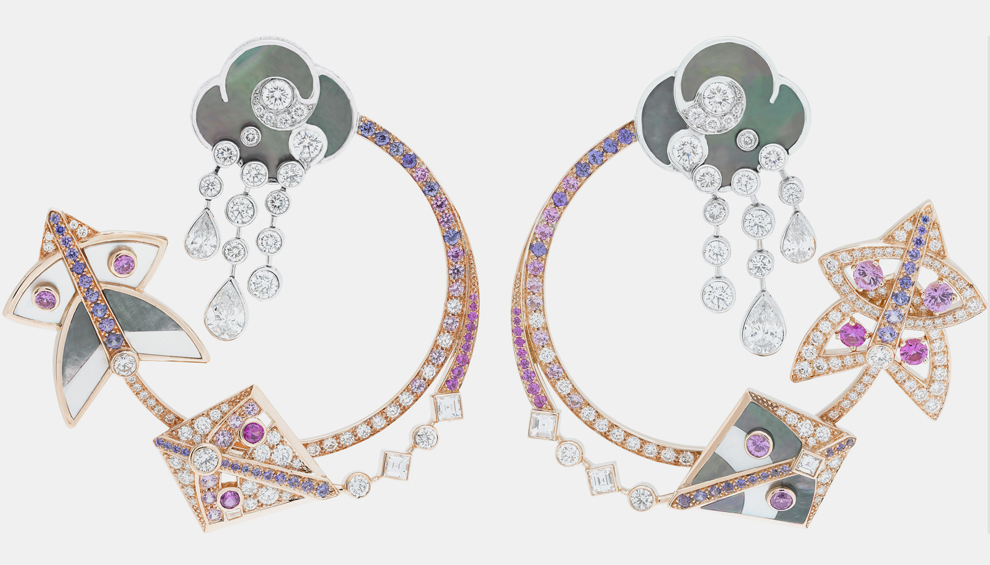 В качестве основного металла ювелиры предпочли белое и розовое золото, оттененное бриллиантами, сапфирами и разноцветным перламутром. Последний украшает самих змеев и стилизованное небо с облаками из бриллиантовых завитков.