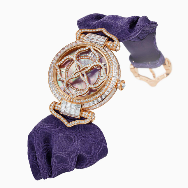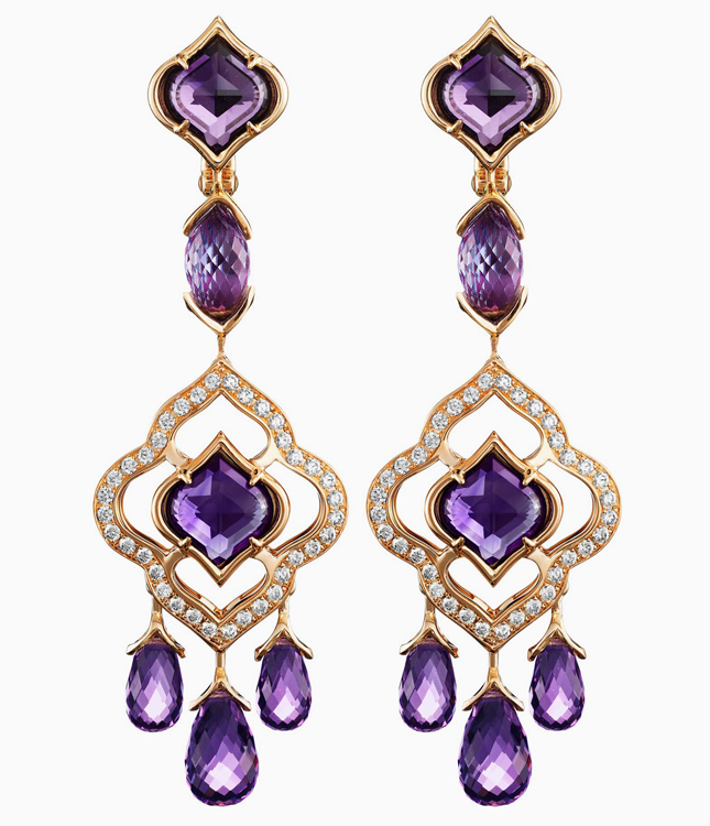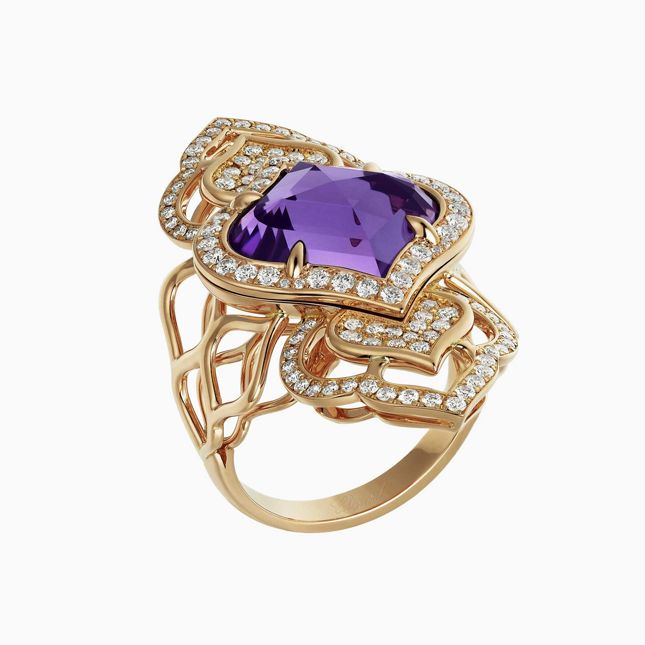 Коллекция Imperiale легко узнается по изящному сочетанию узоров из розового золота, бриллиантов и аметистов. Новинки, представленные Chopard на прошлой неделе, составили лимитированную капсульную линию, получившию название The Empress Jewellery Box — «шкатулка императрицы». В нее вошли крупные серьги, вечерние часы, коктейльное кольцо и, конечно, тиара. Во всех украшениях ипспользованы роскошные аметисты густого сиреневого оттенка.