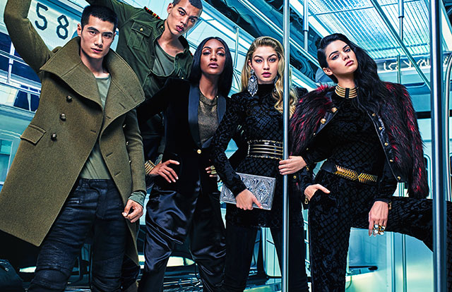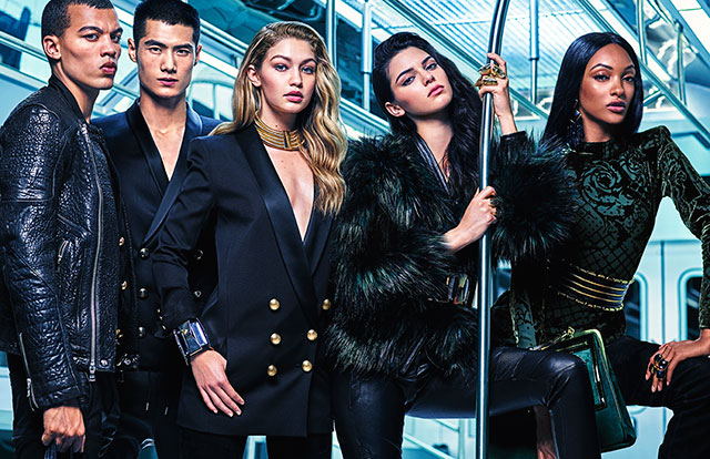 Главными лицами рекламной кампании Balmain x H&M авторства Марио Сооренти стали любимицы и подруги Оливье Рустена Кендалл Дженнер, Джиджи Хадид и Джордан Данн. Съемка получилась такой яркой, сверкающей и насыщенной, что подолгу смотреть на один кадр просто не получится. Золотой декор, блестящие платья, роскошные жакеты с подчеркнутыми плечами, выразительная графичность и геометрия. Мужская часть коллекции получилась несколько более сдержанной и слегка теряется на фоне знаменитых моделей в ослепительных нарядах.
