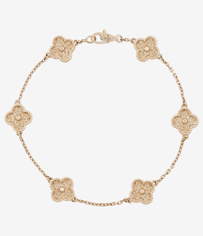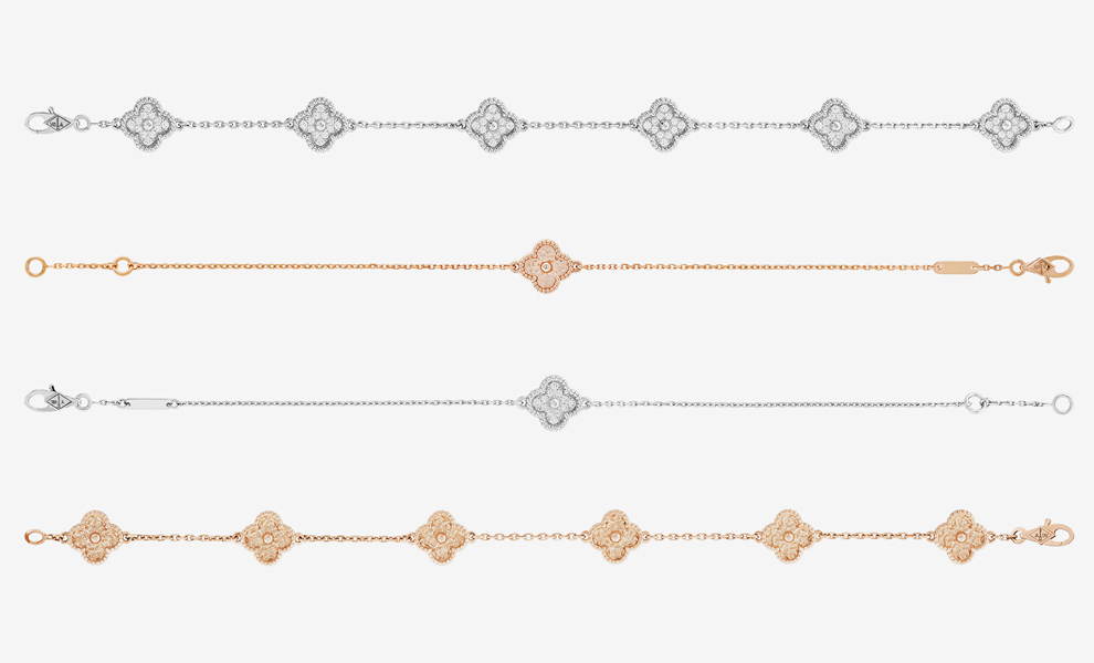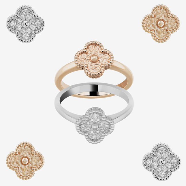 В этом году свою самую узнаваемую коллекцию драгоценностей ювелиры Van Cleef & Arpels расширили за счет украшений с миниатюрными копиями легендарных цветов. Теперь «Альгамбра» пополнилась лаконичными кольцами, кулонами и сотуарами, двумя видами браслетов и серьгами-гвоздиками. В драгоценностях из белого золота крошечные цветочки усыпаны бриллиантовым паве. В версиях из розового золота поверхность цветков декорирована в фактуре самородков.