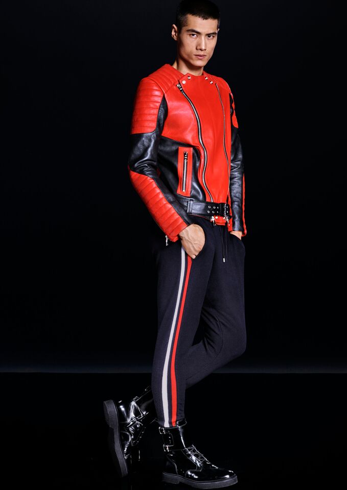 Мужская коллекция чуть меньше женской и выглядит более лаконичной и сдержанной, несмотря на обилие золота. В ней присутствует и спортивный шик, и веяние хип-хоп моды, и вместе с тем изысканная роскошь. В линию вошли футболки, лощеные треники, комбинезоны, обильно декорированные куртки и много всего еще.