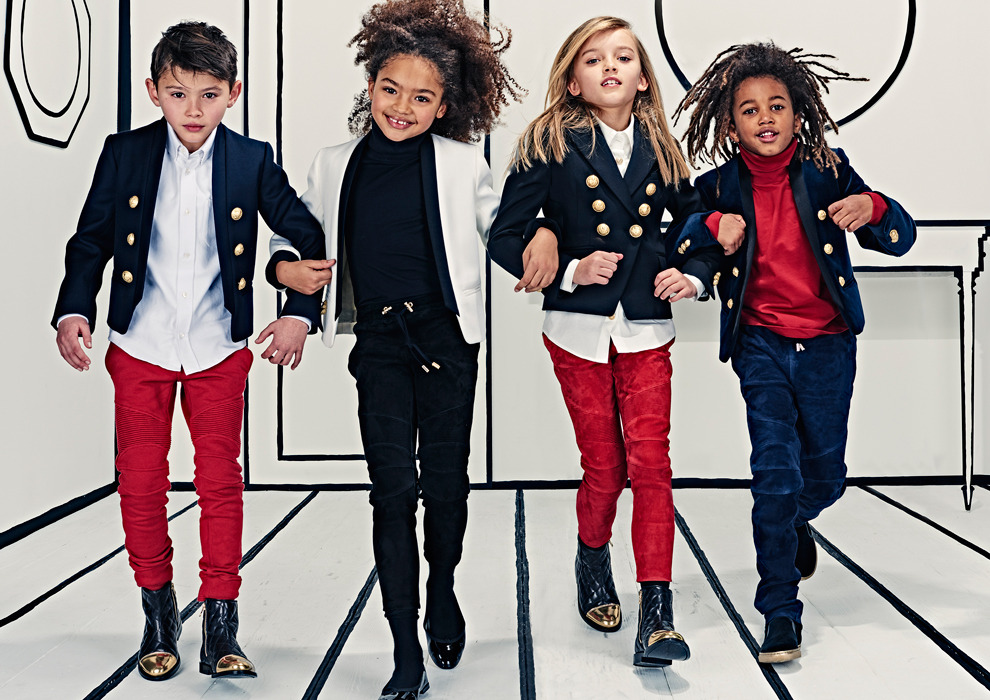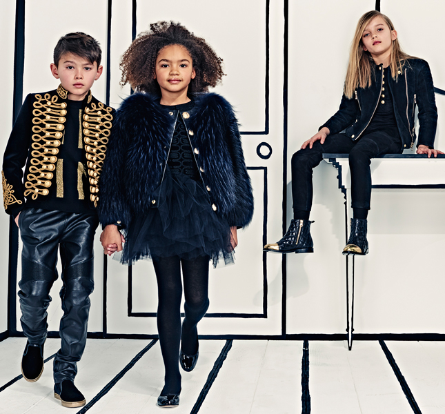 Как заявил сам креативный директор Balmain Оливье Рустен, на создание новой линии его вдохновили наблюдения за тем, как пары совместно совершают покупки. Первая детская коллекция французского модного Дома состоит из 55 моделей для детей в возрасте от 6 до 14 лет. Мотивы более чем знакомы любителям эстетики бренда. Это гусарские куртки, лаковая обувь, двубортные пальто, белые смокинги, крупные золотые и серебряные пуговицы, массивный декор и обильная вышивка. Стоит вся эта детская красота по-взрослому: от 190 евро за футболку с принтом до 5500 евро за платье-пачку для девочки. Продажи стартуют в июне в бутиках Balmain и на официальном сайте марки.