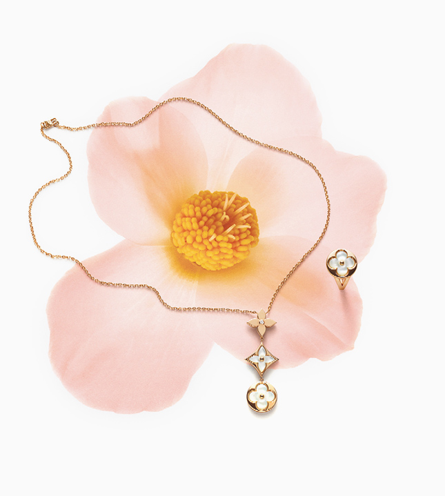 Украшения с узнаваемыми элементами фирменного стиля Louis Vuitton начали выпускать еще пять лет назад, включив их в коллекции и драгоценностей и бижутерии. На этот раз в линию Blossom вошли украшения из розового и желтого золота с полудрагоценными камнями вместо эмали. Из самоцветов, вопреки модному тренду на яркие камни вроде малахита и лазурита, предпочтение было отдано теплому красному карнелиану, коньячному тигровому глазу и черному таитянскому перламутру (он заменил привычный оникс). В коллекцию вошли выполненные в минималистичной манере колье, серьги и браслеты. А в двух весьма изысканных колье-сотуарах нашлось место и маленьким бриллиантам.