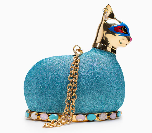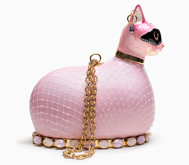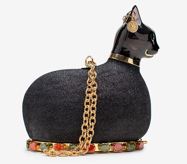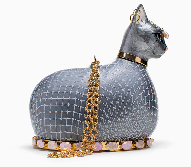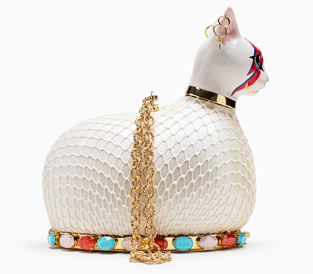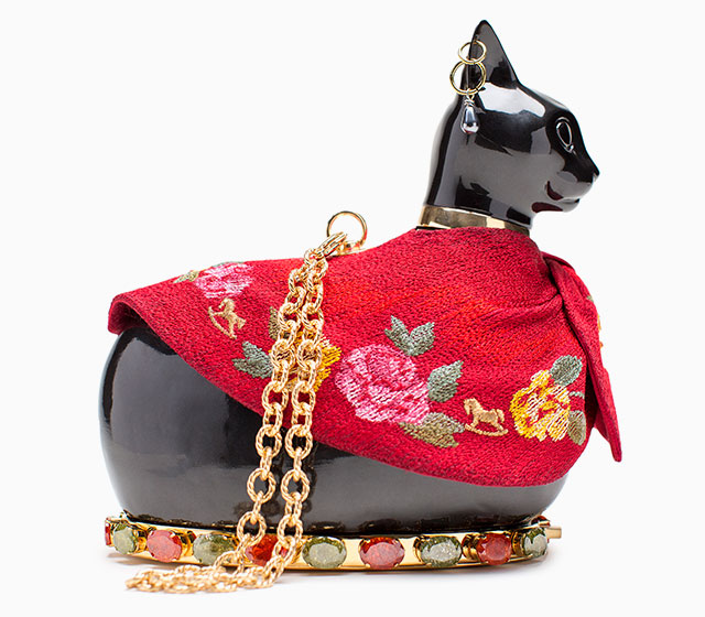 В коллекцию вошли сразу 6 кошечек, каждая в своем оригинальном образе: гостья маскарада при дворе французских королей, черная пантера, индийская принцесса, цыганка в алом расписном платке, артистка кабаре и даже поклонница Дэвида Боуи. Клатчи сделаны из металла, вручную расписаны эмалью, инкрустированы полудрагоценными камнями и покрыты блестящей глазурью.