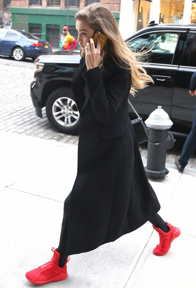 На показе дебютной коллекции Рианны для Puma по подиуму прошлись сестры Хадид, а кроссовки Fenty x Puma The Trainer были представлены в мужской версии. Но уже в летней коллекции появилась женская модель чудо-кроссовок сразу в четырех цветах: черном, белом, сером и красном. В алых кроссовках Fenty x Puma уже была замечена на улице Нью-Йорка Джиджи Хадид.