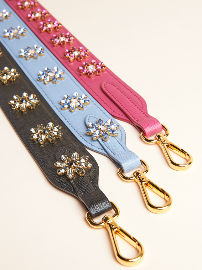 В коллекцию вошли ремни с крупными цветами из телячьей кожи, камней и стразов. Эффектный аксессуар можно носить отдельно или дополнить им одну из культовых моделей сумок Prada Galleria, Giardiniera или Double. Отстегивающиеся ремни Prada поступят в продажу в московские бутики марки в июле по цене от 56500 рублей.