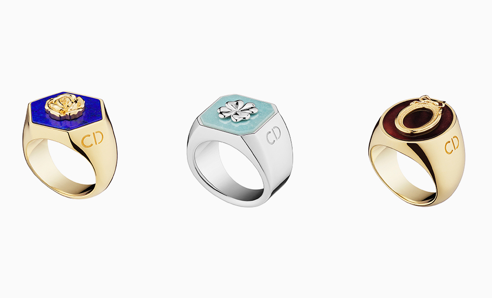 На розовом кварце цветет любимый самим маэстро ландыш, а на оникс села пчела, символизирующая цветочные сады и ювелирный труд мастериц ателье Dior. Путеводная звезда на тигровом глазе ведет обладателя кольца к переменам к лучшему, роза на лазурите напоминает о культовых бальных платьях, а клевер на амазоните призван приносить счастье. Наконец, яркий коралл украшают инициалы великого кутюрье, а овальная рамка на флюорите символизирует его любимую эпоху рококо.