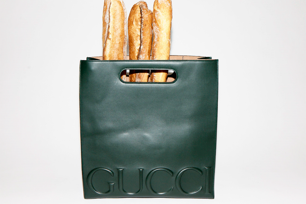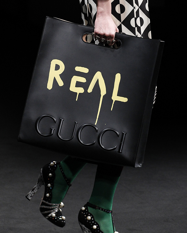 Черная кожаная сумка прямоугольной формы с плоским дном, боковыми складками и врезными ручками появилась на показе осенней коллекции Gucci с надписью Real от художника-граффитиста Gucci Ghost. А в продажу новинка поступила еще в двух цветах – красном и темно-зеленом, но уже без принта. Сумка выполнена из гладкой кожи и, помимо врезных ручек, снабжена длинным ремнем. «Пакет» Gucci уже приглянулся Мадонне.