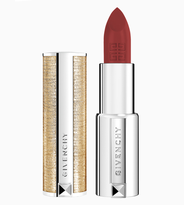 Коробочки знаменитой рассыпчатой пудры-призмы из четырех пастельных оттенков и теней для век из четырех золотистых оттенков покрыты золотой тканью. Тени создают зеркальный эффект и придают глазам металлический блеск. Помада, вошедшая в рождественскую коллекцию, конечно не могла быть никакого иного цвета, кроме темно-красного. К помаде прилагается коллекционный футляр Le Rouge, который подойдет и к другим помадам марки.