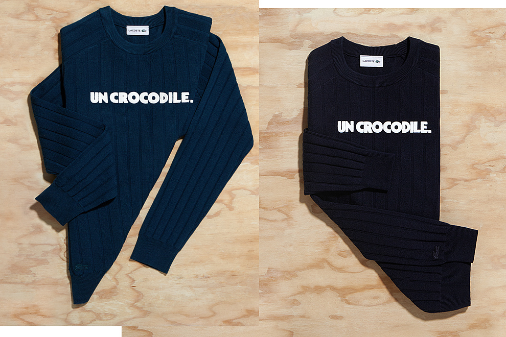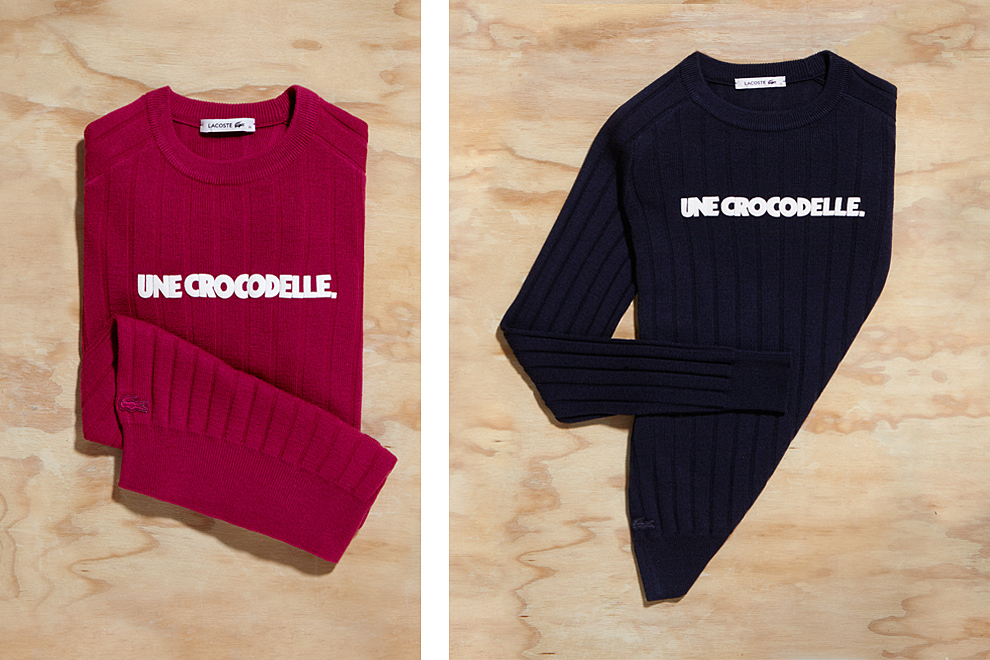 Дизайнеры Lacoste выпустили линию теплых «рифленых» свитеров из стопроцентной шерсти с парными надписями. Женские свитера, представленные в сером, синем и оттенке фуксии, украшает надпись «Une Crocodelle» - «крокодилиха». На черном и темно-синем мужских вариантах, как легко догадаться, написано «Un Crocodile» - «крокодил». Коллекция уже поступила в продажу.