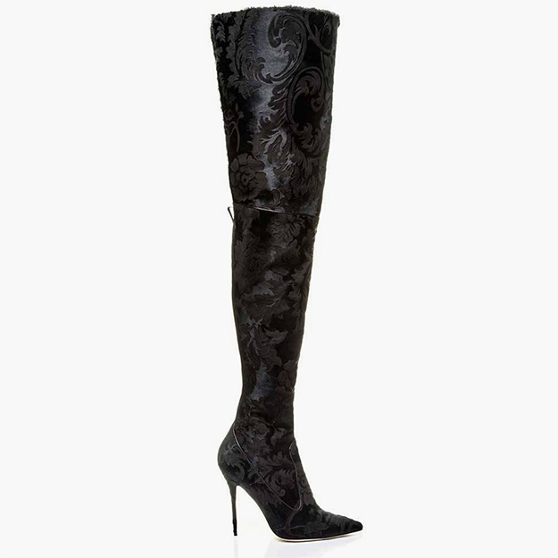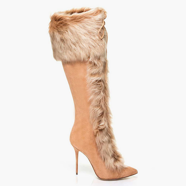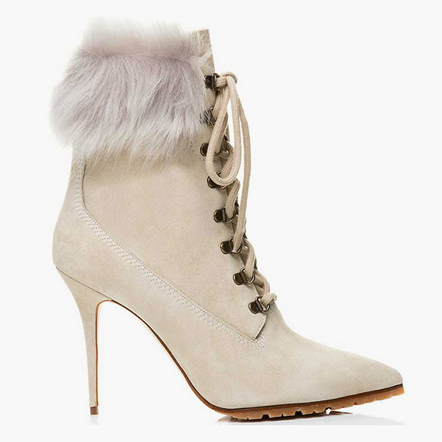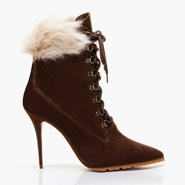Базовая модель коллекции – замшевые ботинки с опушкой, напоминающие классические «тимберденды», только с острым носом и на шпильке. Они представлены в двух цветах – кофейном и слоновой кости. Следующая модель – замшевые сапоги с опушкой из густой овчины тоже в двух оттенках – слоновой кости и корицы. Наконец, третья модель – высокие ботфорты на шпильке в графитовом черном цвете с изящным рифленым рисунком.