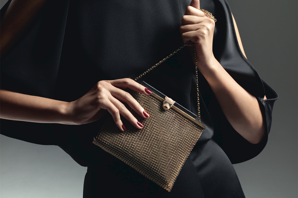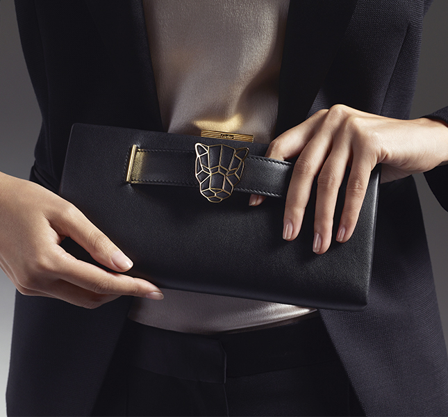 В новогоднюю мини-линейку вошли два маленьких черных клатча-кошелька из роскошной кожи теленка и крокодила. Священное животное Cartier – пятнистая пантера – в виде брошки украшает ремешки клатчей. Еще одна модель в коллекции - сумочка из кольчуги – отсылка к ридикюлю Дома образца 1906 года с драгоценной совой на замочке, только на этот раз место совы заняла голова пантеры из оникса с бриллиантами и изумрудами.
