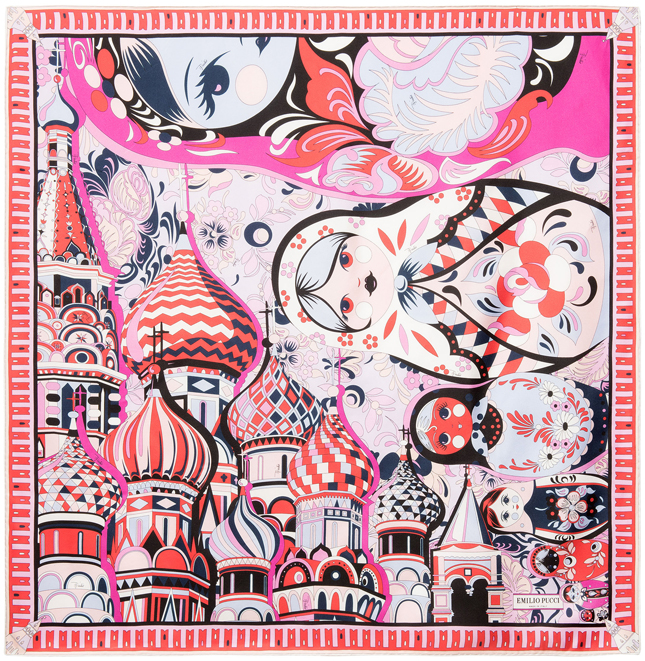 Наконец, в знаменитой серии шелковых платков «Города мира» итальянского Дома Emilio Pucci появилось посвящение Москве. На платке в розово-алых тонах изображены матрешки и храм Василия Блаженного. Мини-линейку дополнили топ и пижамный костюм из легкого шелкового твила. Презентация коллекции, посвященной российской столице, пройдет 21 марта в московском ЦУМе, а затем начнутся ее продажи в бутиках Emilio Pucci.