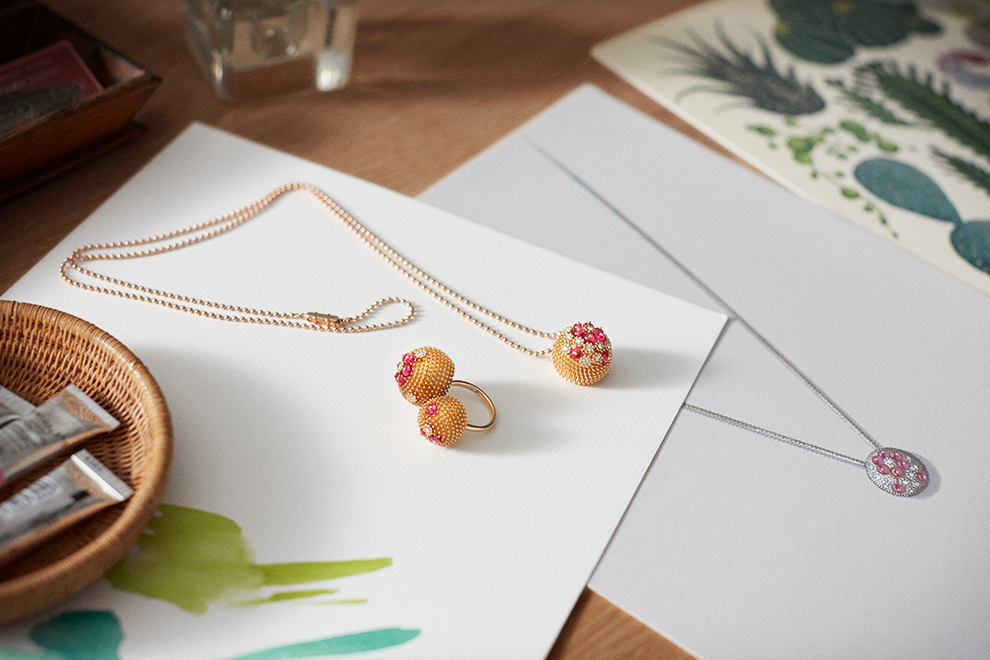 В новую коллекцию вошли серьги, кольца и кулоны из желтого, белого и розового золота, в которых филигранные золотые иголки обрамляют бриллианты и розовую шпинель. Кроме того, среди новинок две вечерние сумочки с драгоценными застежками из уже знакомых по первому выпуску изумрудов и сердолика.