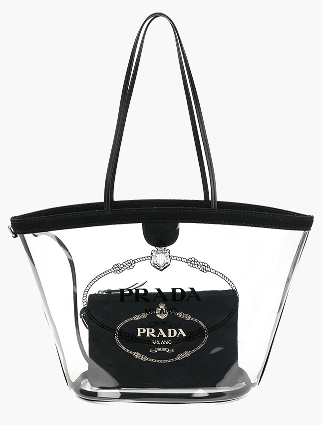 Вслед за коллекциями Jil Sander и Chanel сумки из бесцветной, прозрачной пластмассы появились и в ассортименте Prada. Это вместительные модели с большим логотипом и двумя вариантами цвета канта – красным и черным. Сумки уже в продаже по цене 59 000 рублей.